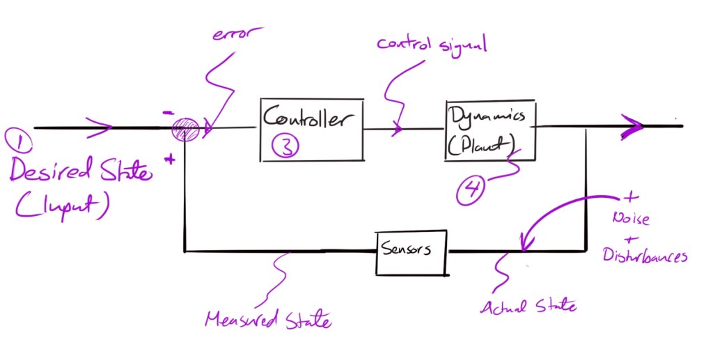 Purple lines are signals. Black Boxes are functions or processes — (called transfer functions in the frequency domain). We can design the controller, but the Dynamics of the Plant (thing to be controlled, e.g. power plant or drone) are given to us by nature, e.g. mass, length and outside our control.