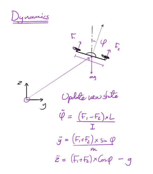 In the below image we show the most basic representations of Newton’s F=ma equations of motion for our drone, taken instantaneously. For a 2D system, these are actually sufficient to model the dynamics.