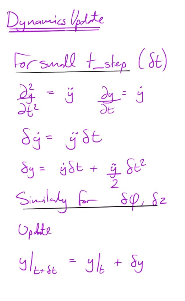 In both cases for a 2D drone, by “solving” the equations of motion we are evaluating the acceleration then estimating the resultant velocity (and hence position) at small time intervals using discrete integration — which is a Taylor Series approximation.